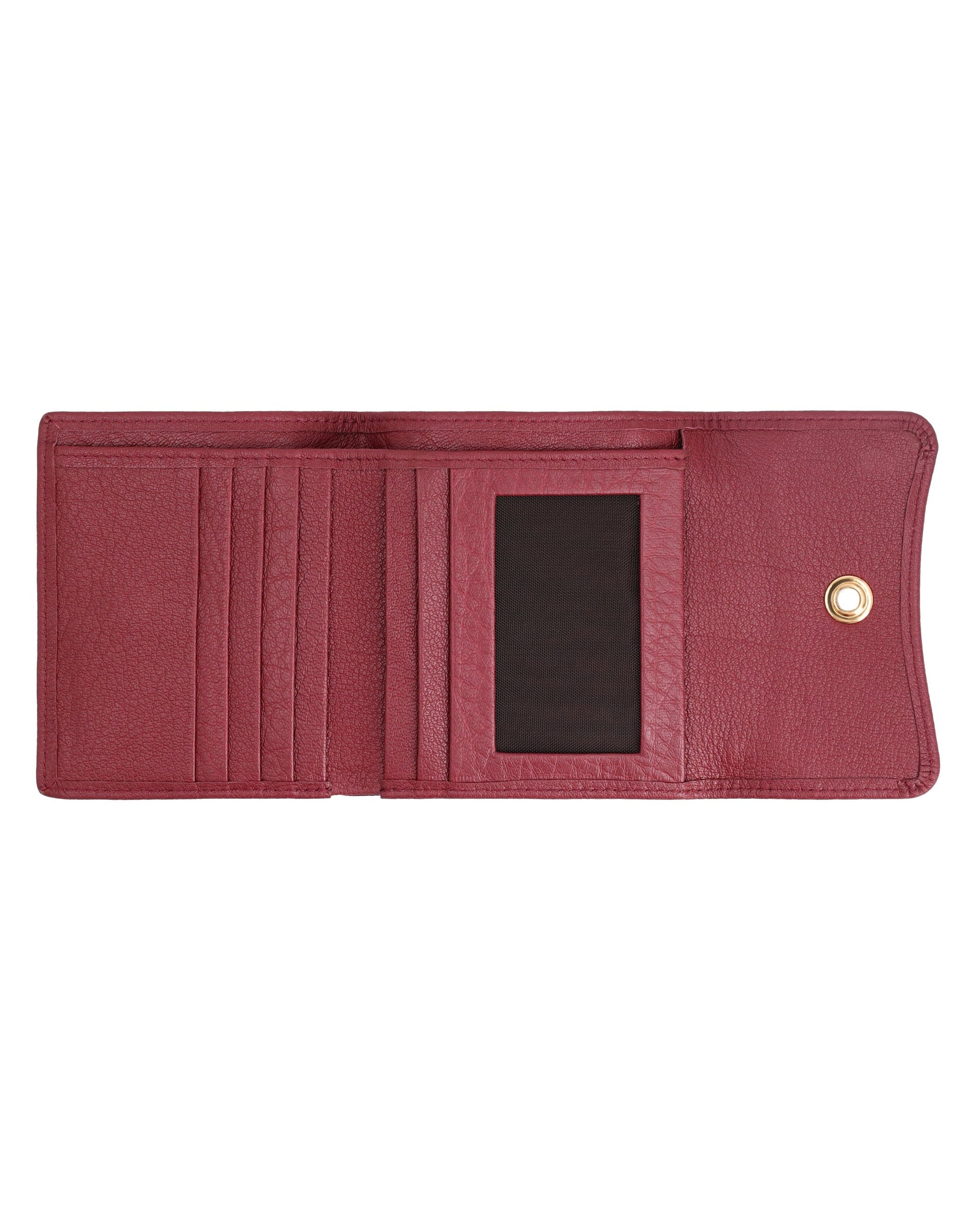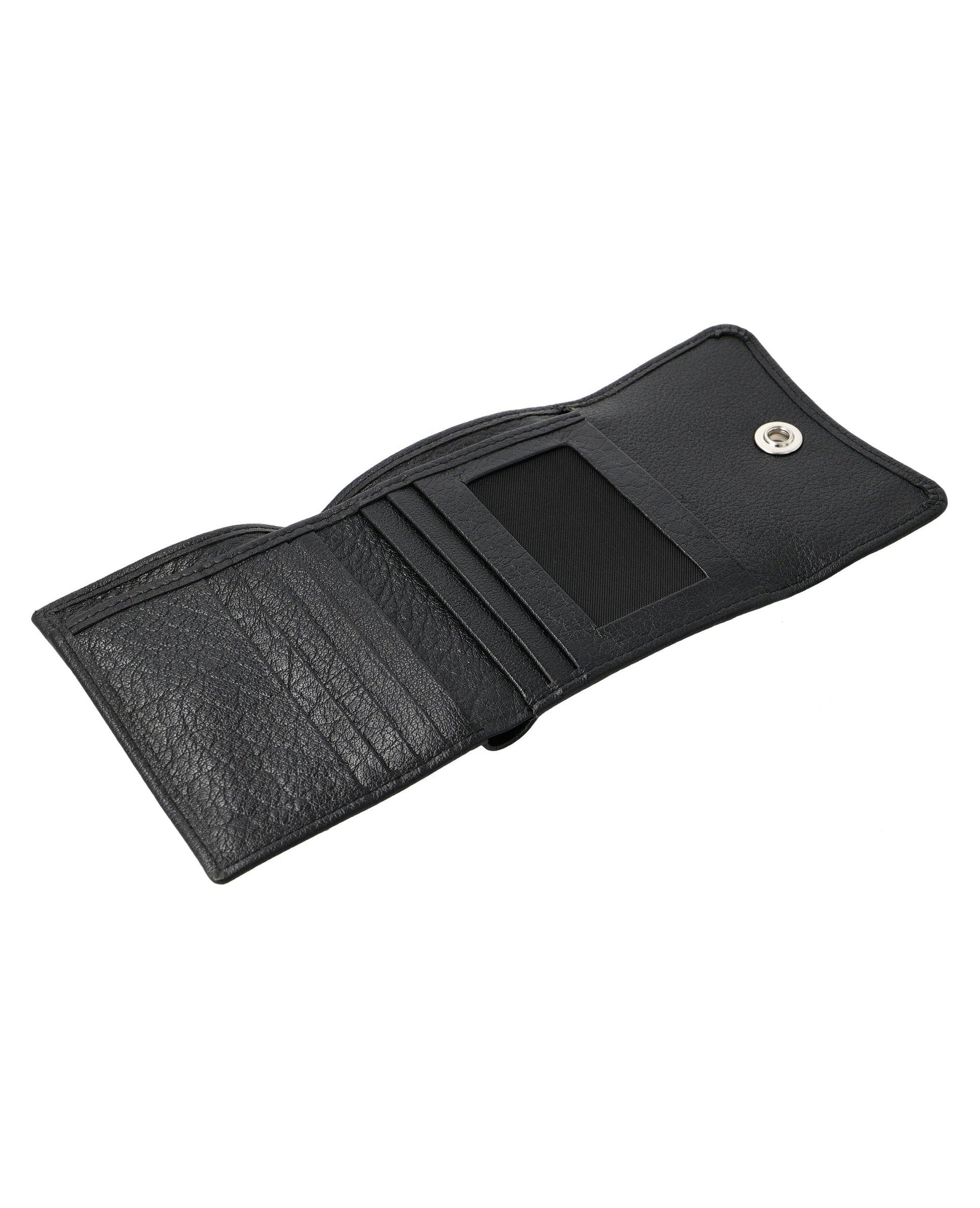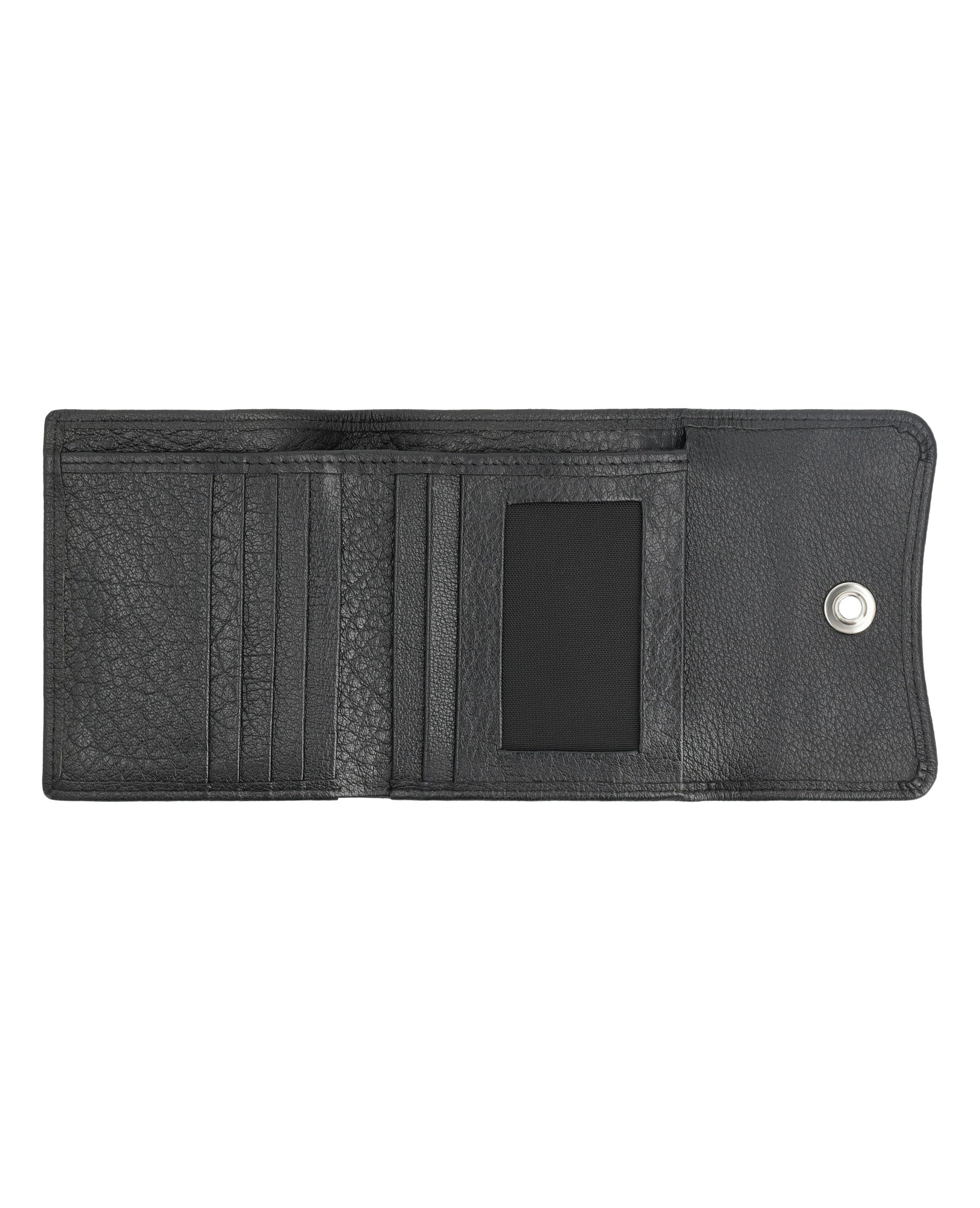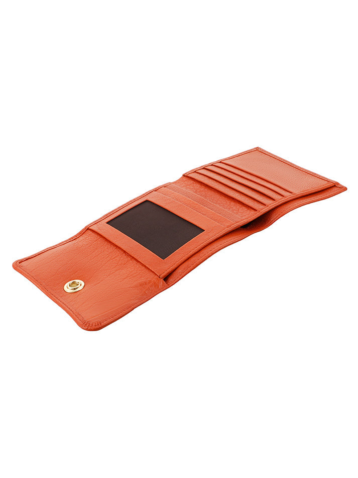 Sleek, small leather wallet with snap closure offers easy access to essentials and keeps cards organized.
