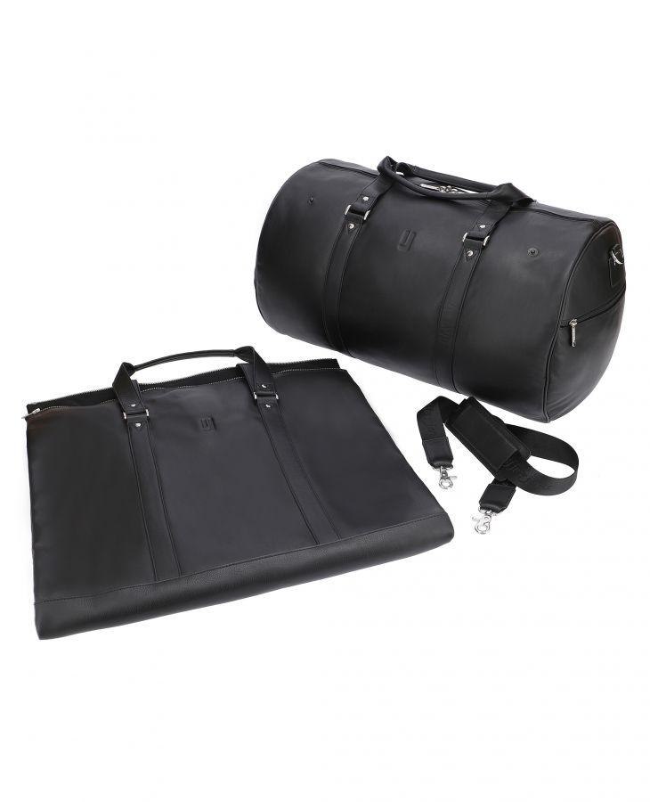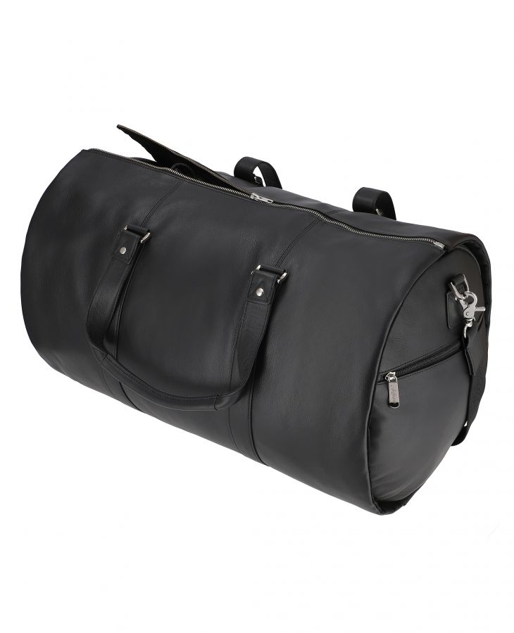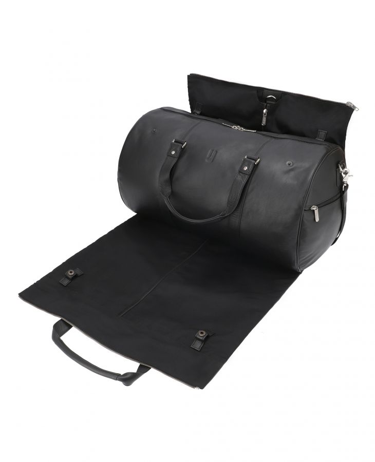Classic and Spacious, this soft leather duffel coat bag features top velcro closure, double hand handles, exterior zip pockets, inside zip pocket and a detachable suit carrier with a detachable shoulder strap. A wooden hanger is included with this duffel bag. Perfect companion for your travelling