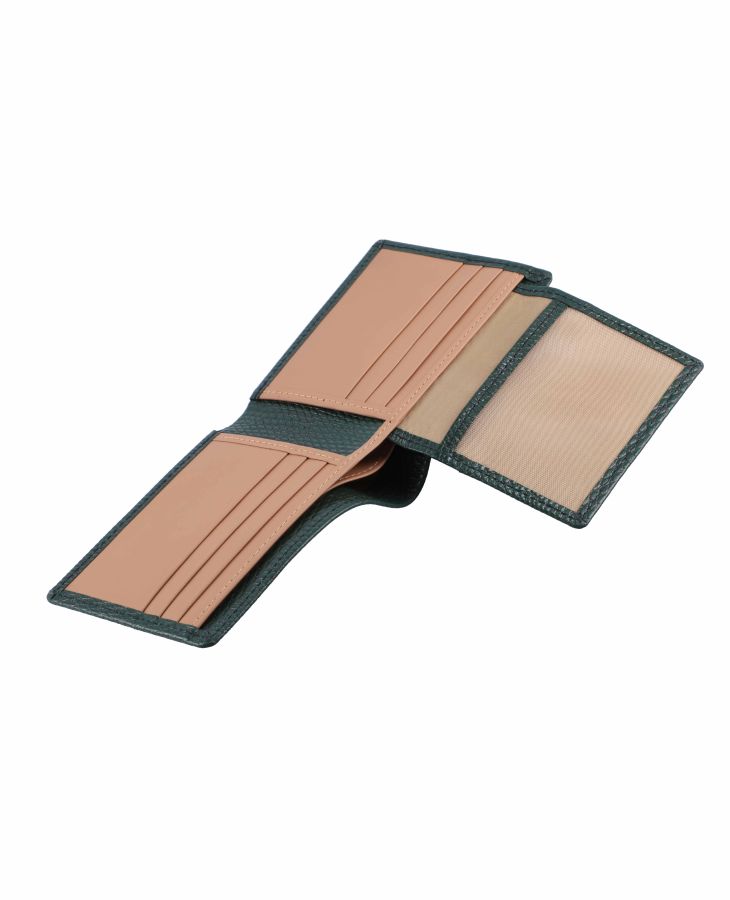 Our lizard embossed leather adds zest to our classic design which comfortably holds six credit cards and cash. This design is available in emerald green and maroon for those that want glitz with style.
